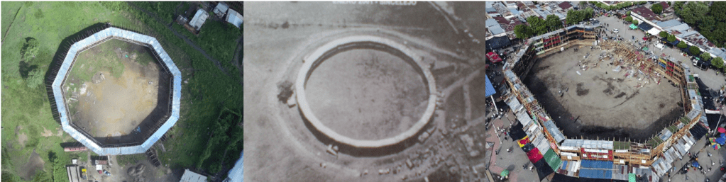 Espacialmente se puede decir que las corralejas pueden tener varias configuraciones: la que visité tiene forma de polígono circular, pero en las referencias históricas se mencionan configuraciones de los palcos en forma rectangular. En la última corraleja que colapsó, se presentaba una forma en planta octogonal con dos de los lados alargados. No se sabe bien si la elección de estas formas se debe al sitio o al sistema constructivo. Valdría la pena mapear dónde se ejecuta esta forma para entender si se puede deber a la idiosincrasia de cada región, dado que las corralejas en los últimos años se han expandido más allá de las fronteras de los departamentos donde se originó.